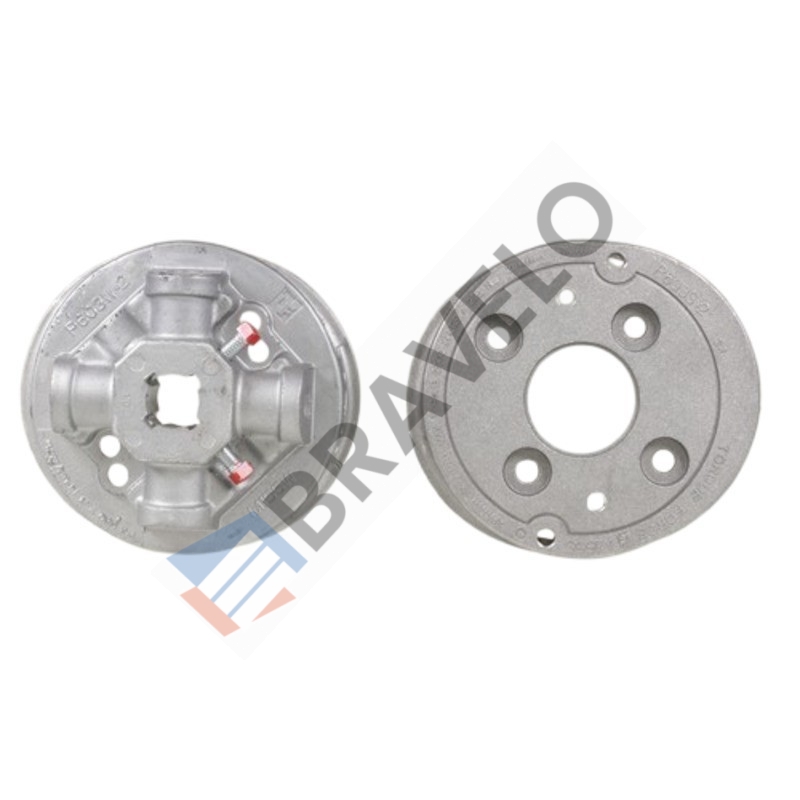 Komplet zawiera 1 czop do nakręcania sprężyn i 1 czop stacjonarne. Odległość osi otworów do mocowania wynosi 136mm. Czopy dostarczane są razem z dwoma śrubami do mocowania.